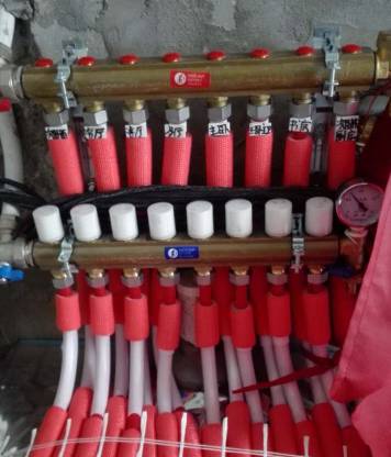 在过道、分集水器下方等管道密集处,为了防止局部过热,应该用保温套管处理进水管。下图为分集水器处保温套管处理。