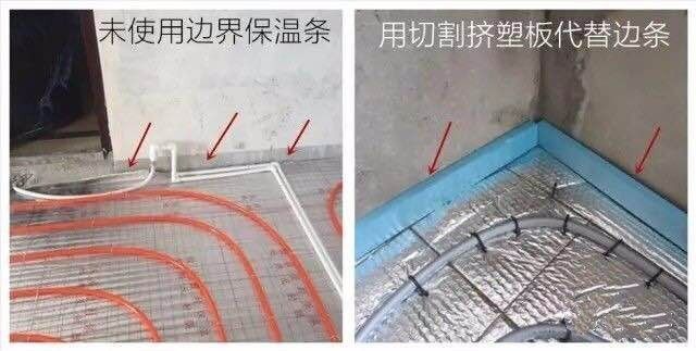 边条是作为地暖保温部分中的侧面绝热层,主要主要作用时阻止热量从墙体和柱体散失。还有就是边条采用EVA材质,蠕变性强(就是压缩后可以回弹),可以抵消回填层热胀冷缩。下图为正确施工。